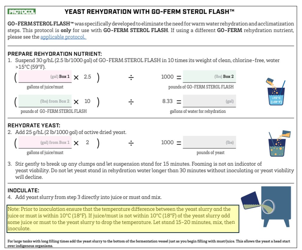 While Go-Ferm Sterol Flash provides an opportunity for winemakers to skip the juice acclimatization step, as is marketed, it’s also true that for colder juices or musts, bringing the yeast/nutrient slurry within 10°C (18°F) of the juice/must getting inoculated is still recommended. You can find this information within the “Learning” material on Scott Labs’ website with regards to rehydration protocols with Go-Ferm Sterol Flash.